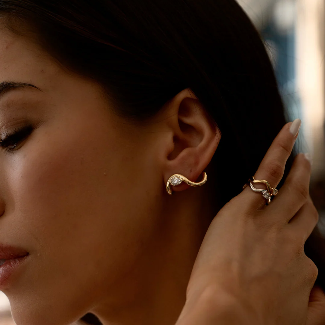 The Coquette Curve hugs the lobe in a sculptural sweep of gold, anchored by a 0.50 CT lab-grown pear diamond. It’s intentionally shaped to follow your ear—not just sit on it—making it the go-to when you want your jewelry to have a point of view.