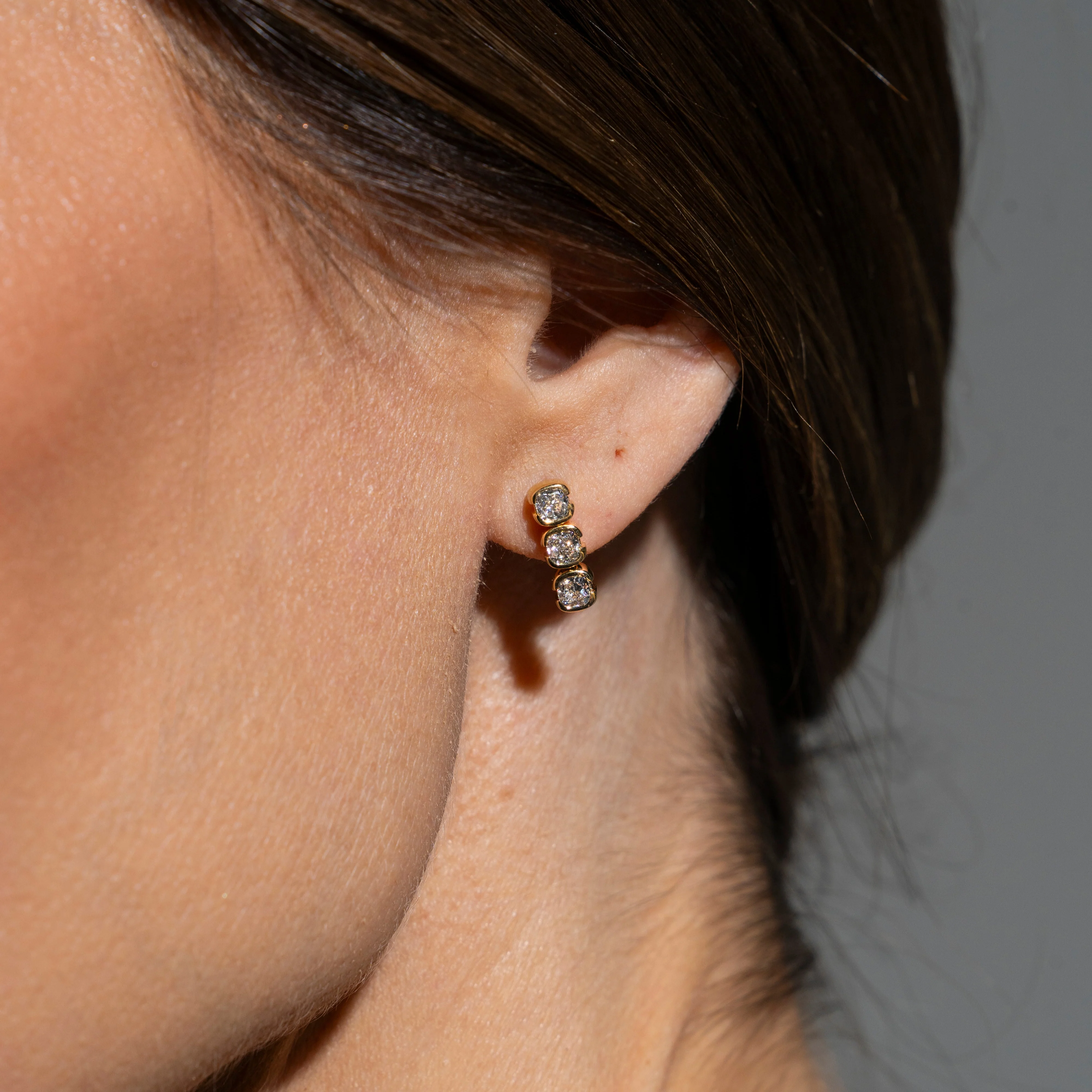 The Muse Mini Drop Earring features three cushion-cut lab-grown diamonds in a crisp vertical line—each one semi-bezel set for clean edges and maximum light play. It’s graphic, stackable, and just the right amount of movement.