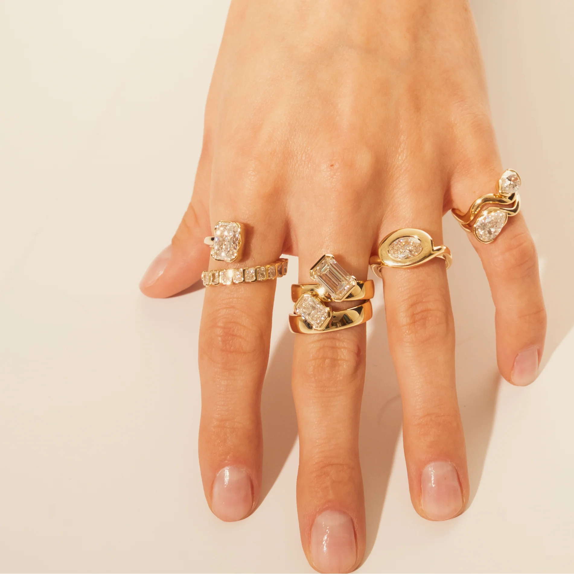 The Revel Wrap Ring reimagines a classic silhouette with bold proportions and an open, asymmetrical band. A radiant-cut lab diamond takes center stage, framed by a row of bezel-set accents that curve around the finger for unexpected edge. Available in multiple center stone sizes and your choice of 18K yellow or white gold.